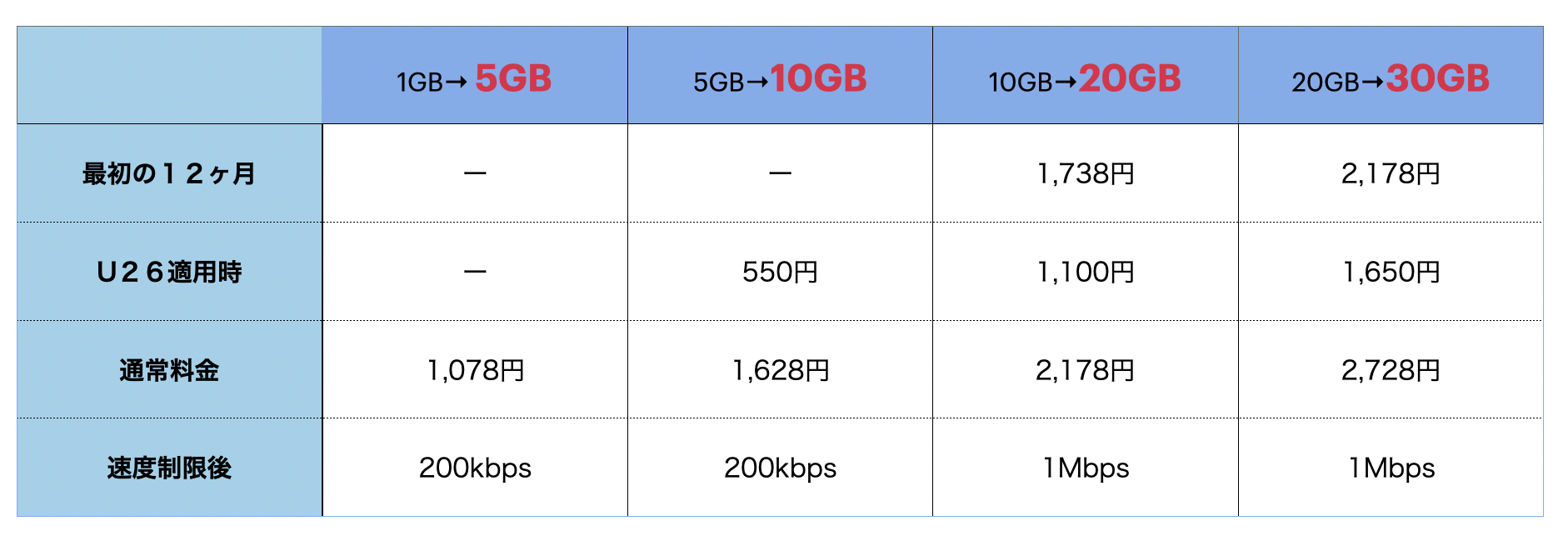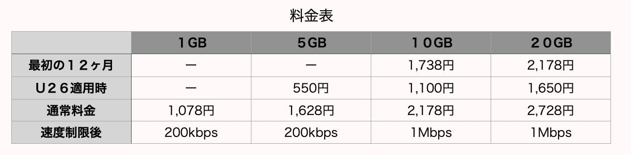 料金プランは1GB=1,078円、5GB=1,628円、10GB=2,178円、20GB=2,728円となっています。