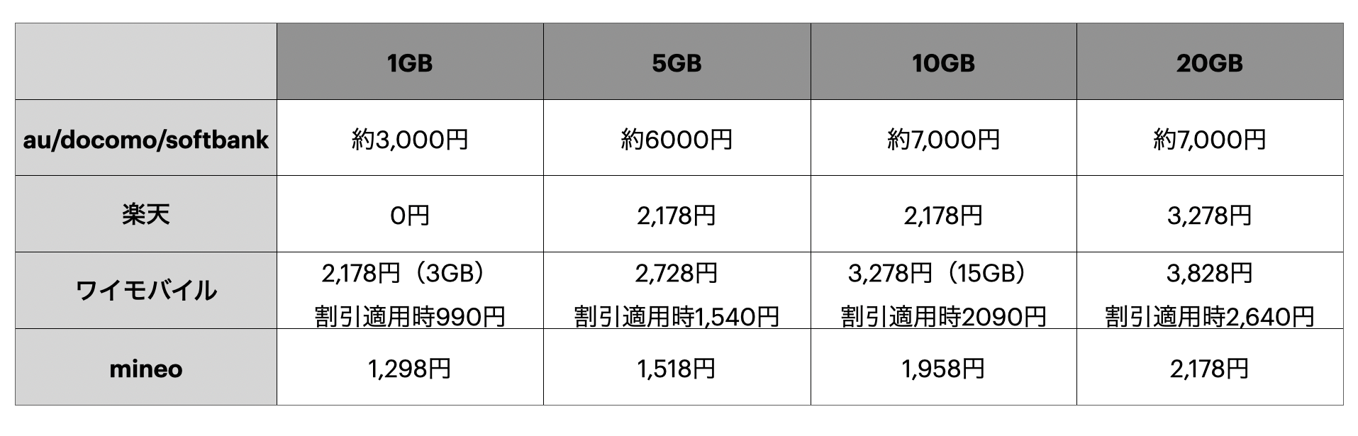 大手3社(au,docomo,softbank)と楽天、ワイモバイル、mineoと比較してみました。